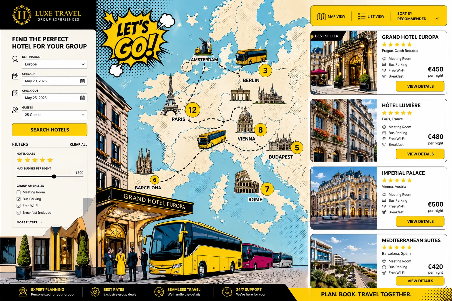 Der Fokus liegt klar auf dem B2B-Segment: Reiseveranstalter, Incoming-Agenturen und Busreise-Anbieter sollen hier schnell das passende Gruppenhotel finden – ohne umständliche Einzelanfragen bei jedem Haus.