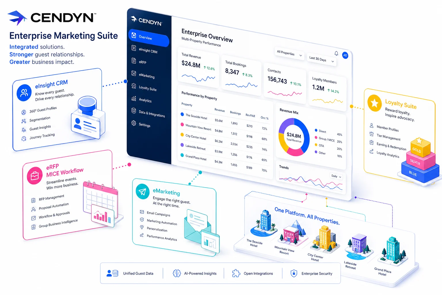 Cendyn ist seit 1996 in Boca Raton (Florida) eine vollständige Marketing-Cloud-Suite für die Hotellerie. Anders als Revinate (Email-fokussiert) deckt Cendyn die komplette Kette ab: eInsight CRM, eMarketing, eRFP (Tagungs-Anfragen-Management), Loyalty Suite und neuere CDP-Funktionen. Das Unternehmen ist besonders stark im Konzern- und Resort-Segment vertreten, mit großen Implementierungen bei Marriott, Hyatt, Wyndham, Hilton und vielen unabhängigen Premium-Marken.