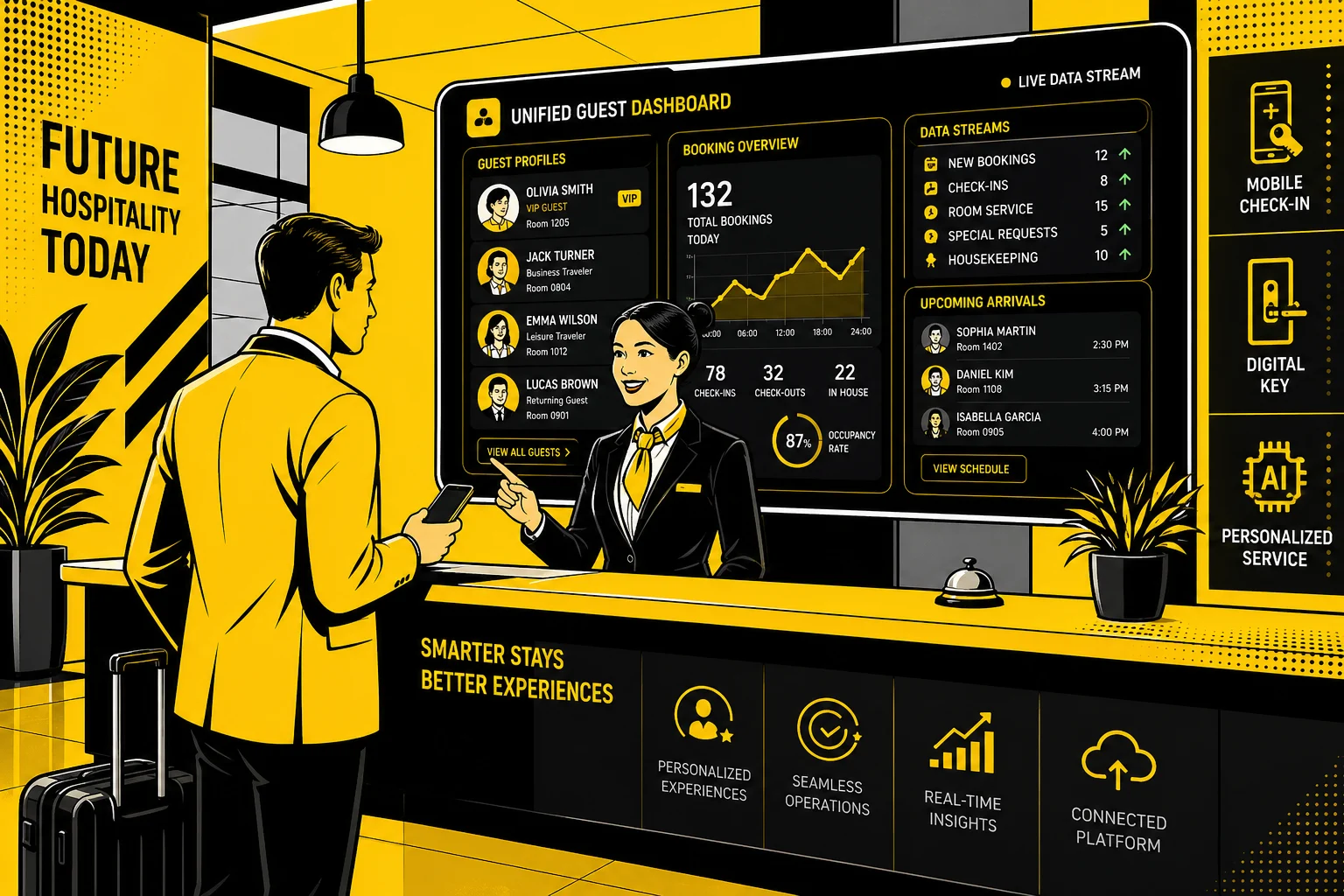 Das Problem vieler Hotels ist kein Marketingbudget und kein Preisproblem – es ist ein Datenproblem. Wer mehrere Systeme parallel betreibt, die per Schnittstelle synchronisiert werden, kennt das Resultat: veraltete Gastprofile, doppelte Datensätze, fehlende Präferenzen am Front Desk.