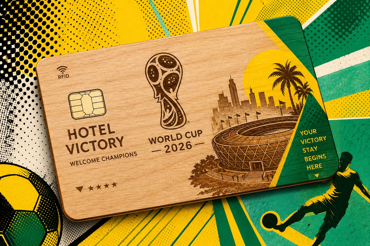 Hölzerne Keycards liegen im Trend: Hotels setzen sie als nachhaltiges Statement und Souvenir zugleich ein. Zur Fußball-WM 2026, bei der Gastgeber-Städte mit bis zu 66 % mehr Hotelnachfrage rechnen, werden individuell gestaltete Holzkarten zum Differenzierungsmerkmal – funktional per RFID oder NFC, emotional als Mitnahme-Objekt.