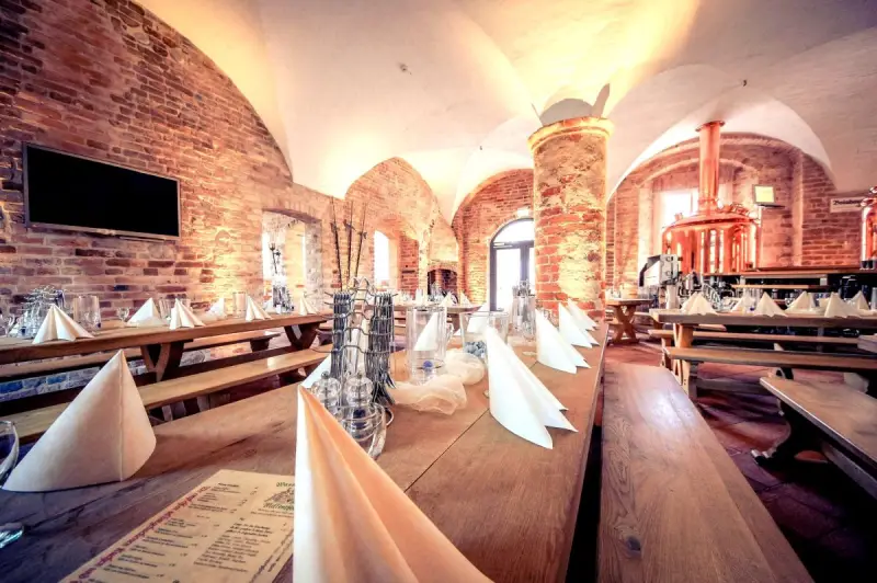 In den Gewölben der schlosseigenen Brauerei im rechten Seitenflügel des Haupthauses startet das Abendprogramm täglich um 18 Uhr. Jeder Wochentag hat ein eigenes Konzept – kein generisches Buffet, das überall stehen könnte.