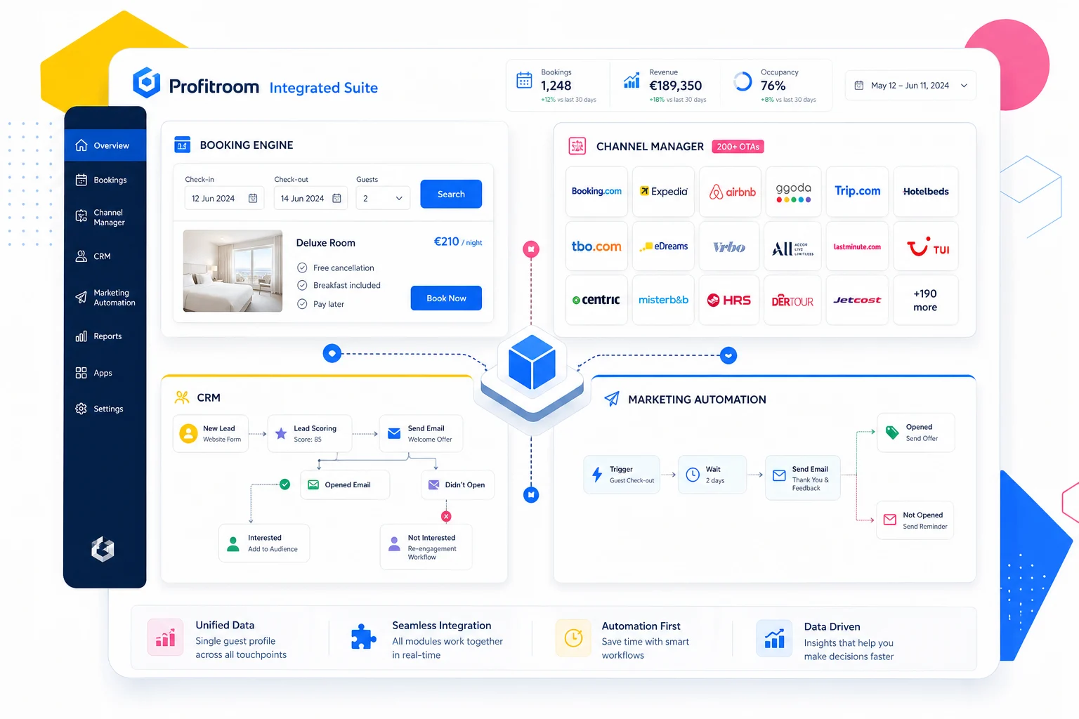 Profitroom aus Warschau bietet eine integrierte Suite aus Booking-Engine, Channel-Manager, CRM und Marketing-Automation. Das polnische Unternehmen ist seit 2008 besonders stark im osteuropäischen und DACH-Resort-Segment vertreten, mit einer wachsenden Präsenz im Wellness- und Hotel-Resort-Markt der Alpen, des Mittelmeerraums und Skandinaviens. Die Differenzierung: alles aus einer Hand — Booking-Engine, Channel-Manager, CRM und Marketing-Tools laufen auf derselben Datenbank, ohne Schnittstellen-Aufwand.